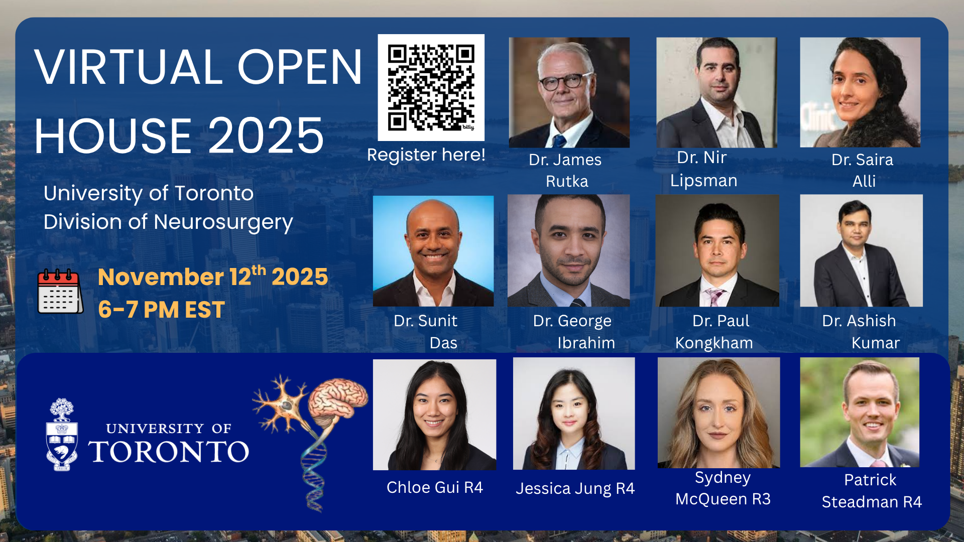 The University of Toronto Neurosurgery program is excited to announce this year’s Virtual Open House where we cover a broad overview of Neurosurgery at the medical student level. This Q&A series provides an opportunity to meet the faculty and learn about the discipline both from faculty and residents. Follow the QR code to register, and do not hesitate to contact us should you have any questions!