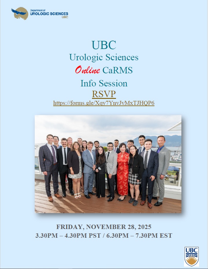 Join UBC's Department of Urologic Sciences for a Virtual CaRMS Info Session on Friday, November 28, 2025, from 3:30 PM to 4:30 PM PST / 6.30 PM to 7.30 PM EST.