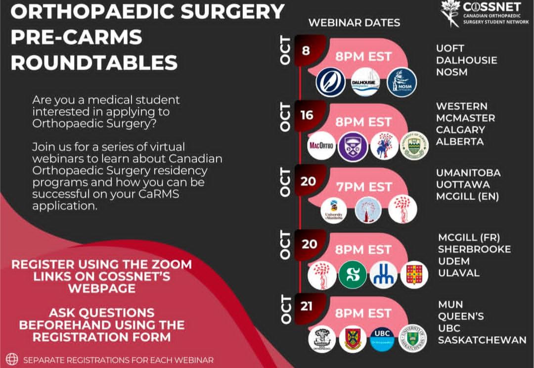 Join us for a series of virtual webinars to learn about Canadian Orthopaedic Surgery residency programs and how you can be successful on your CaRMS application.