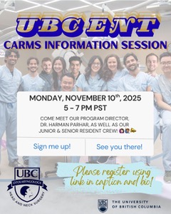 We invite you to join our Residents and Program Director of the UBC Otolaryngology-Head & Neck Surgery program on Monday, November 10 from 5-7pm PST for a CaRMS Info Session. This is a chance to learn more about our program and the upcoming R-1 match and to ask any questions you may have. Please register at the following link: https://forms.gle/i7z4peKAQGQz91am8