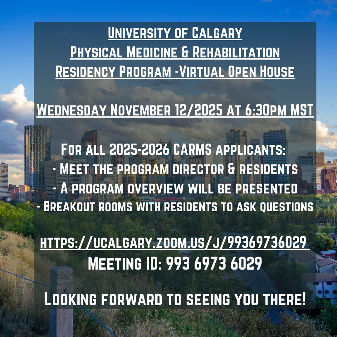 This is a CaRMS information session to meet the program director (PD) and residents for the Physical Medicine and Rehabilitation (PM&R) program at University of Calgary. We plan to have a talk given by our PD about the program, followed by Q&A and breakout sessions with residents. The event will take place virtually over Zoom and the information is below: